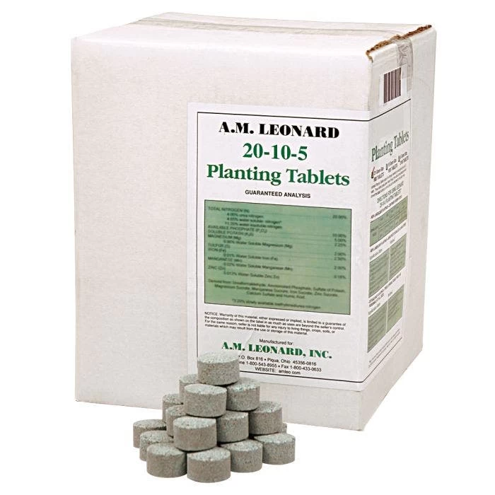 Planting Formula, 20-10-5, 2 Year: Targets new landscape plantings, established landscapes and containerized trees and shrubs. Includes 2.2% magnesium, 2.5% iron, 2% manganese, 0.18% zinc. 10 gram tablets; box of 1,000.