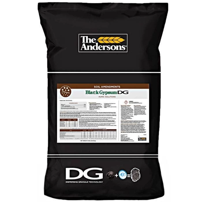 The Andersons formulated Black Gypsum DG with natural chelated gypsum and humic substances. This unique bio-amendment features both a plant-derived carbon source as well as a bio-organic derived source. Sold in 50-pound bags. Black Gypsum DG utilizes Dispersing Granular (DG) technology.