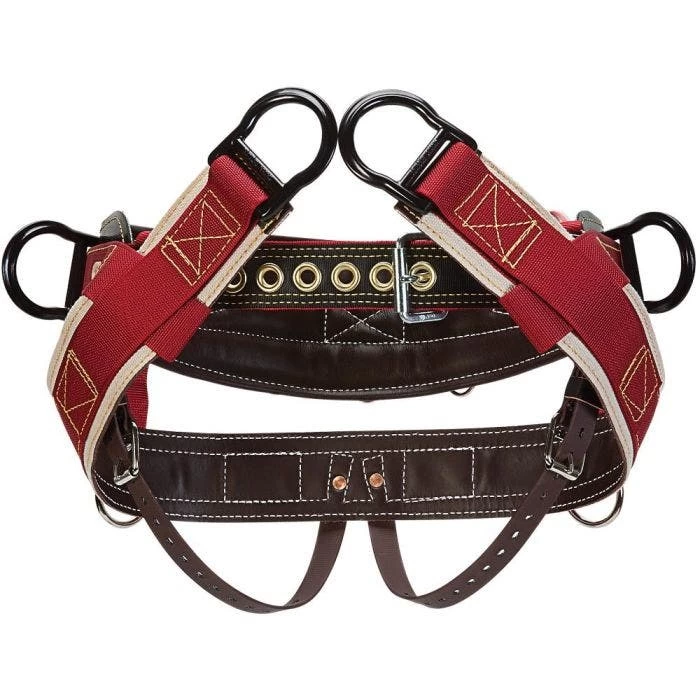 Four fixed dee saddle: This saddle offers a seat strap with fixed D-rings for more stability. 1″ neoprene leg straps keep the seat strap securely in place. The seat strap floats on the waist belt for easier positioning and is lined with soft brown leather. Sizing Note: Allow adjustment for seasonal clothing. NOT FOR FALL ARREST.